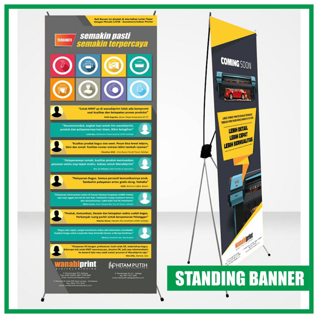 Kami adalah Rumah Percetakan Harga Cetak Stand Banner Online yang menerima berbagai keperluan Promosi Usaha, Bisnis, UKM, Partai, Keperluan Kantor maupun Personal seperti Cetak Brosur, Kartu Nama, Voucher, Tiket, Nota, Bon, Bloknote, Karcis, Kalender, Stiker Label, Cetak Undangan, Kop Surat, Map, Amplop, ID Card, Sertifikat, Dus Kemasan, dan Yasin. Hubungi CS kami di no whatsapp 0878 8777 2311 untuk mengetahui harga cetak Harga Cetak Stand Banner terbaru